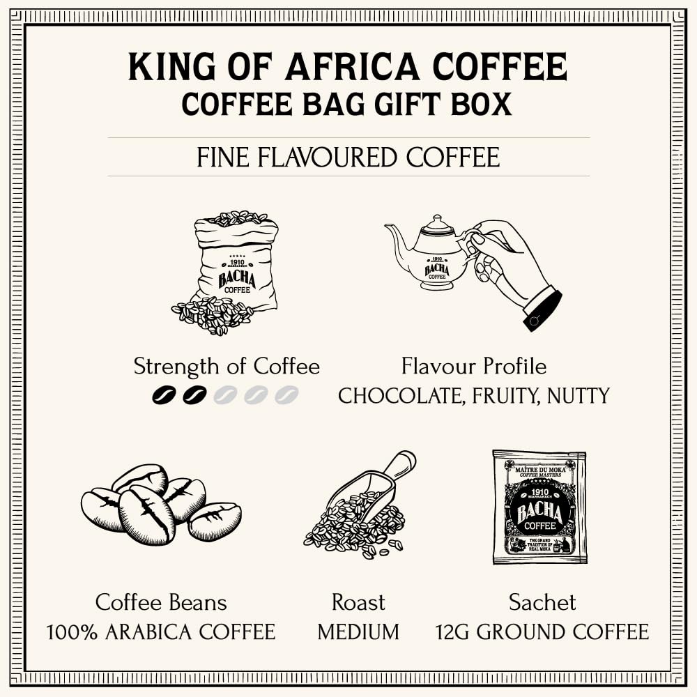 Bacha Coffee King of Africa – 100% Arabica Drip Bags | 12 Sachets x 12g | Premium Flavoured Ground Coffee – 144g