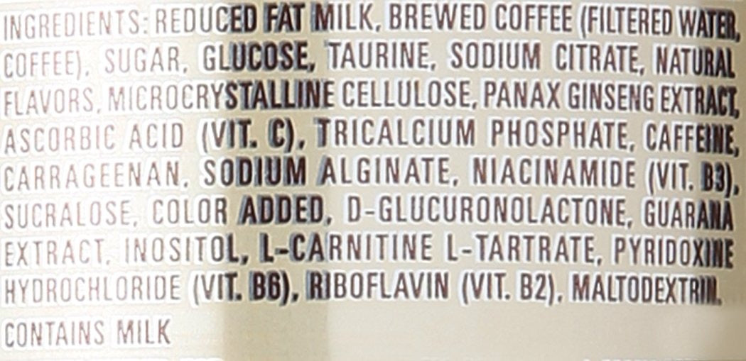 Brewed coffee (filtered water, coffee), 🥛 milk, cream, sugar, glucose, taurine, natural flavors, Panax ginseng flavor, sodium citrate, sodium bicarbonate, sucralose, acesulfame potassium, carrageenan, L-carnitine L-tartrate, caffeine, cellulose gum; Monster energy blend (glucose, taurine, inositol, glucuronolactone, guarana extract, maltodextrin). Contains milk.
