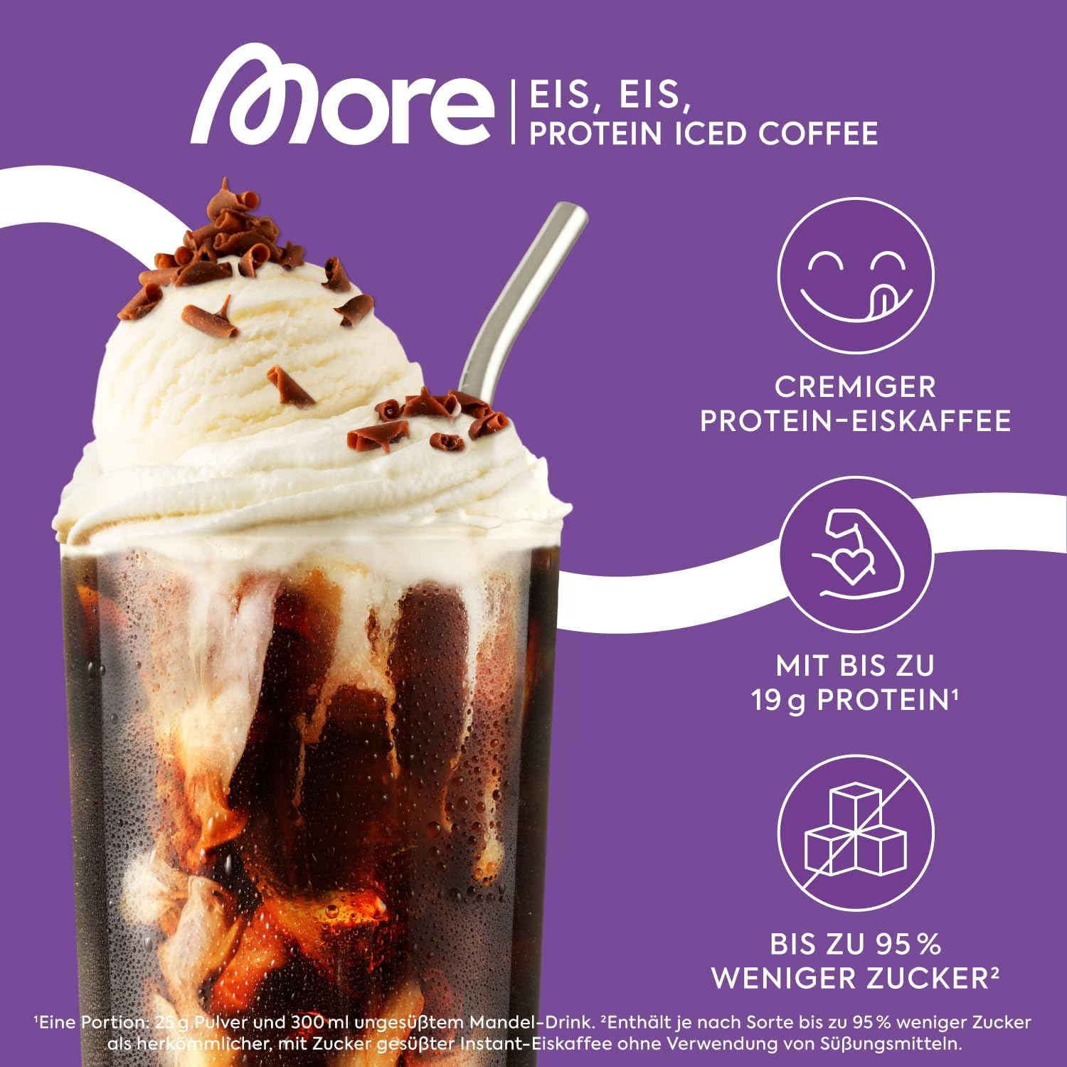 Cool down and power up with MORE Protein Iced Coffee—a silky, café-style drink that blends real coffee with premium protein. Enjoy up to 18 g protein and 95% less sugar per serving for a delicious, smart energy boost at home, at the gym, or at work. 🇩🇪 Made in Germany