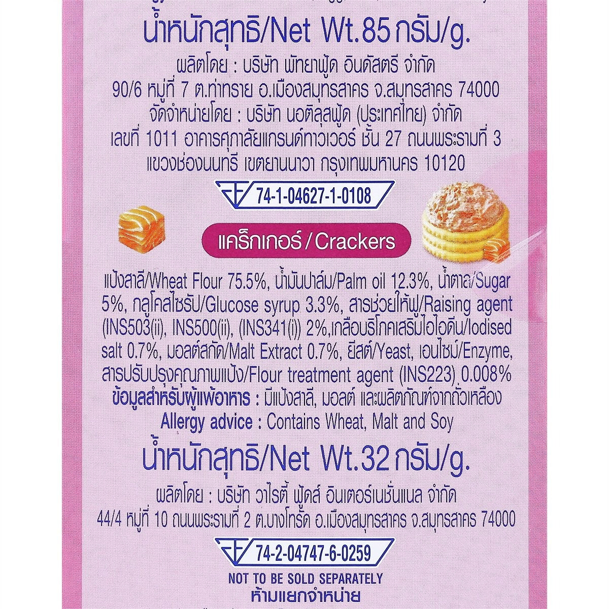 Crackers (32g): Wheat Flour (75.5%), Palm Oil (12.3%), Sugar (5%), Glucose Syrup, Malt Extract, Yeast Extract, Salt, Emulsifier, Baking Powder.